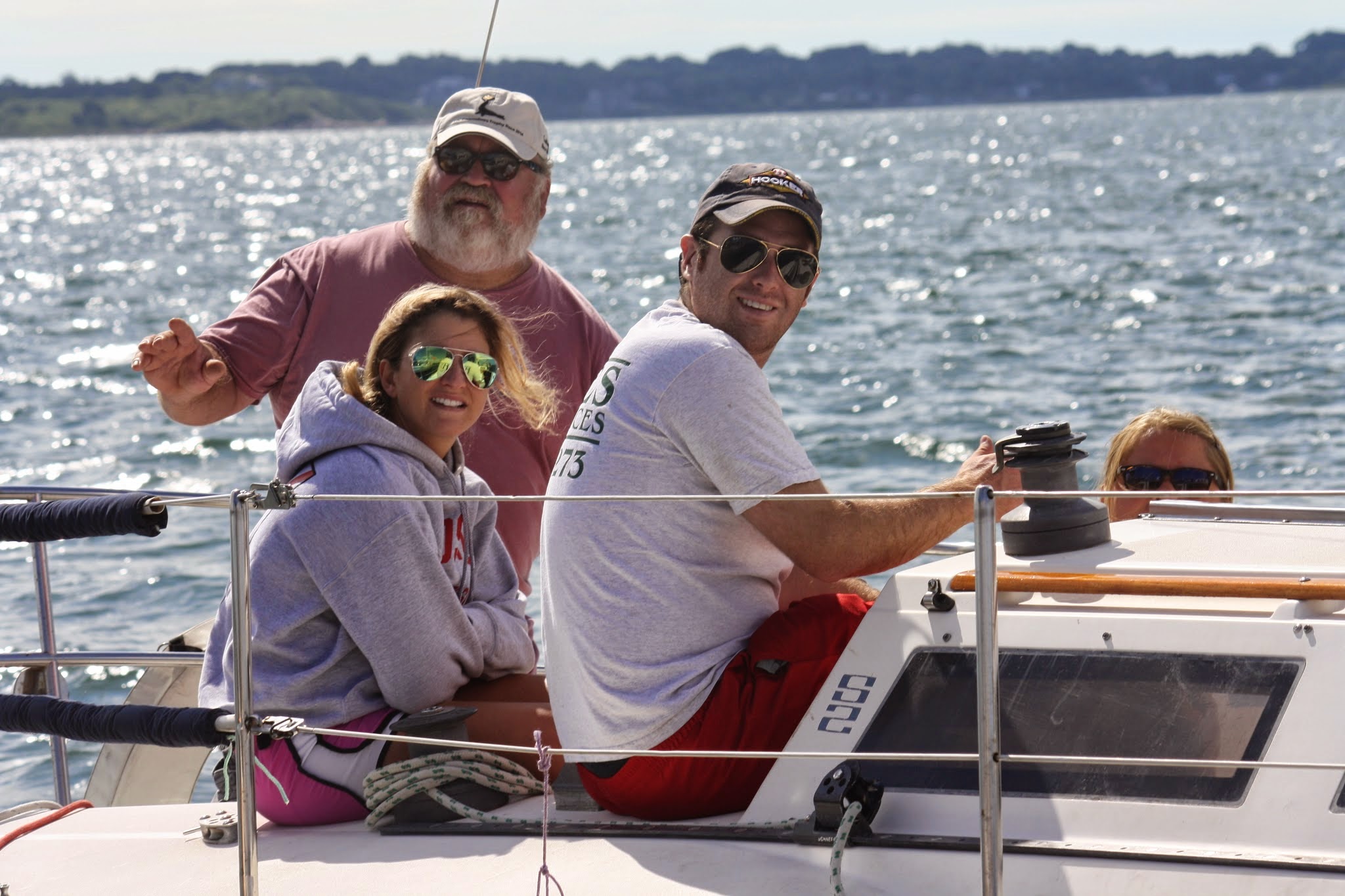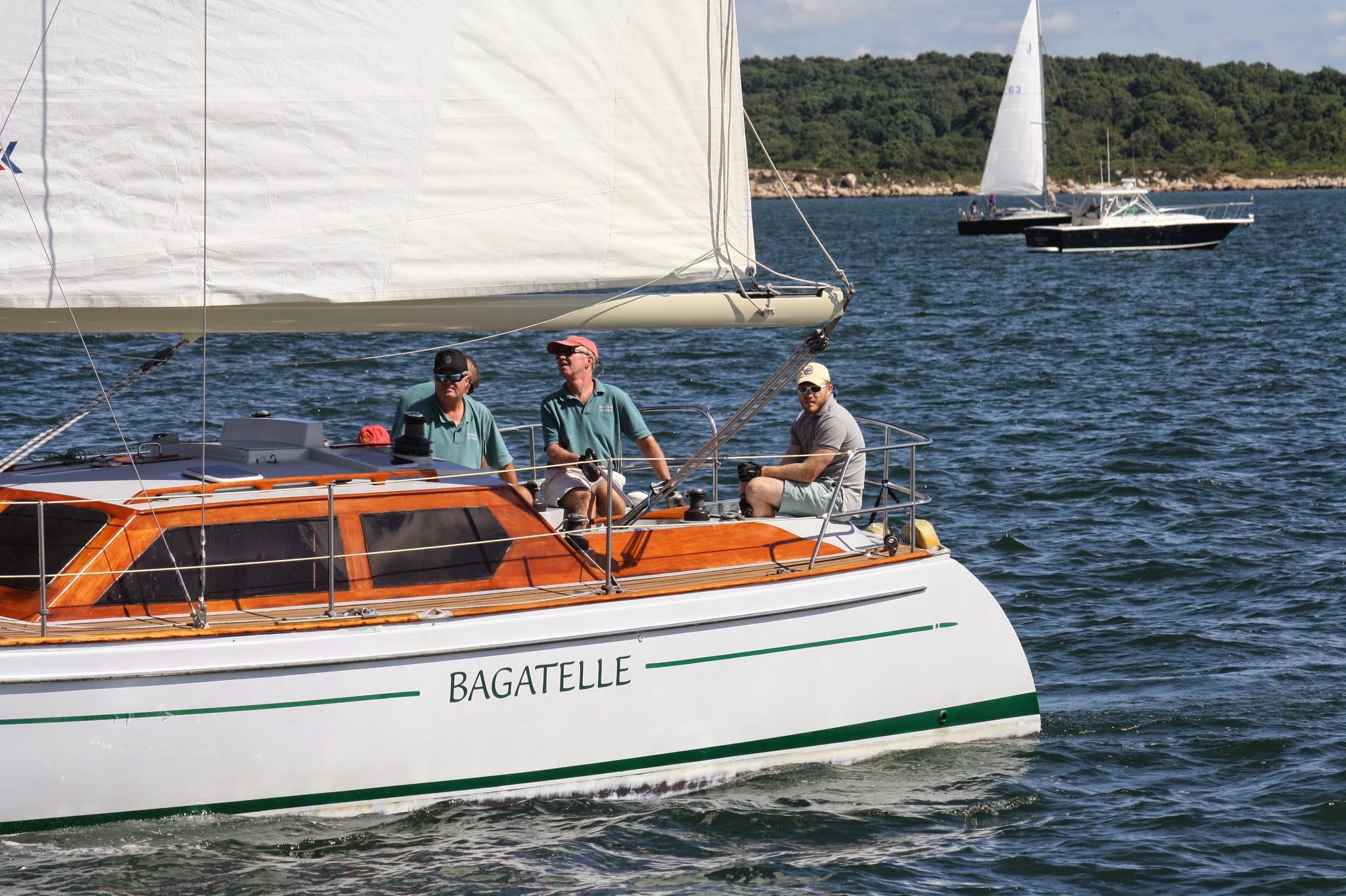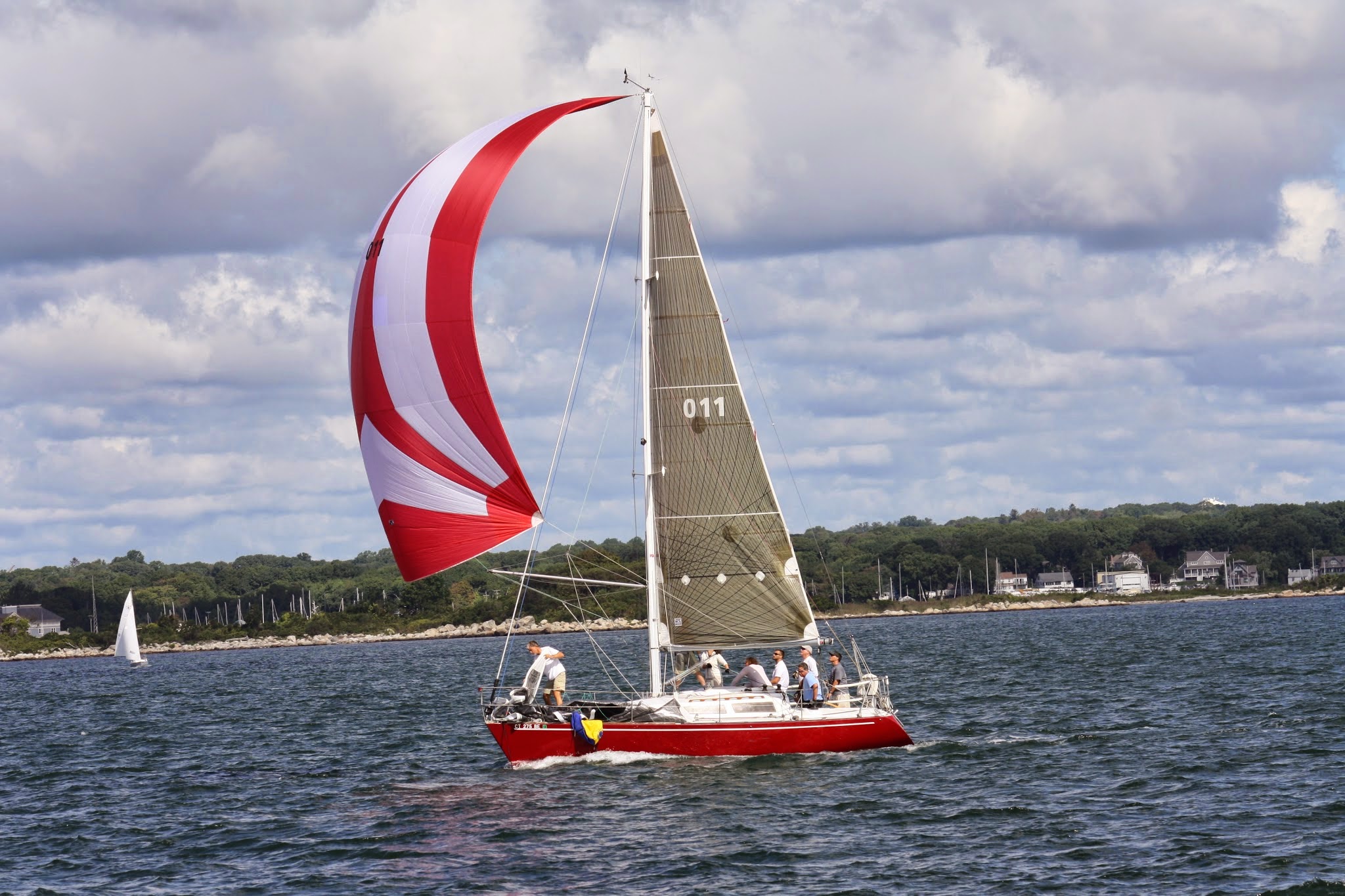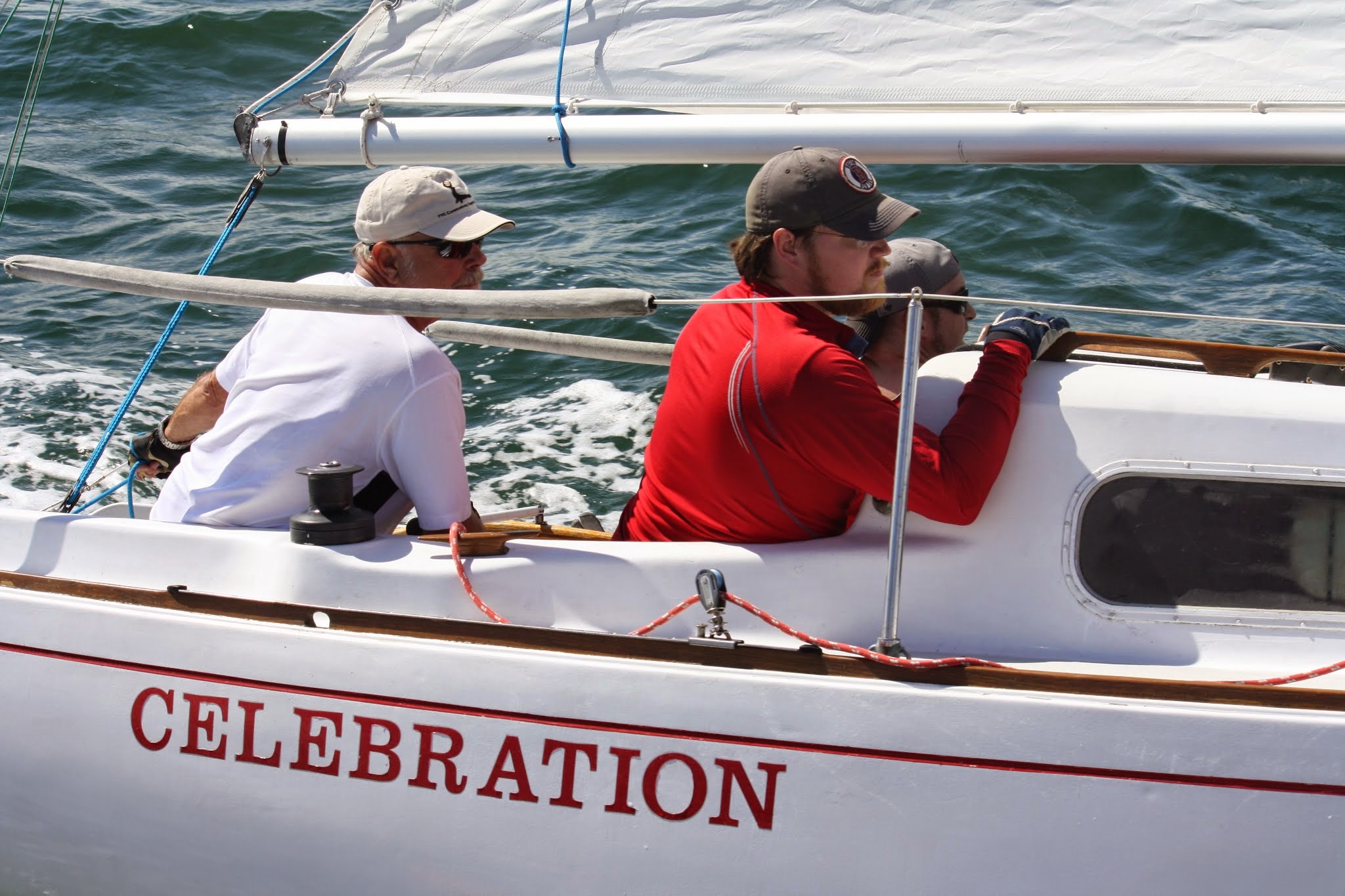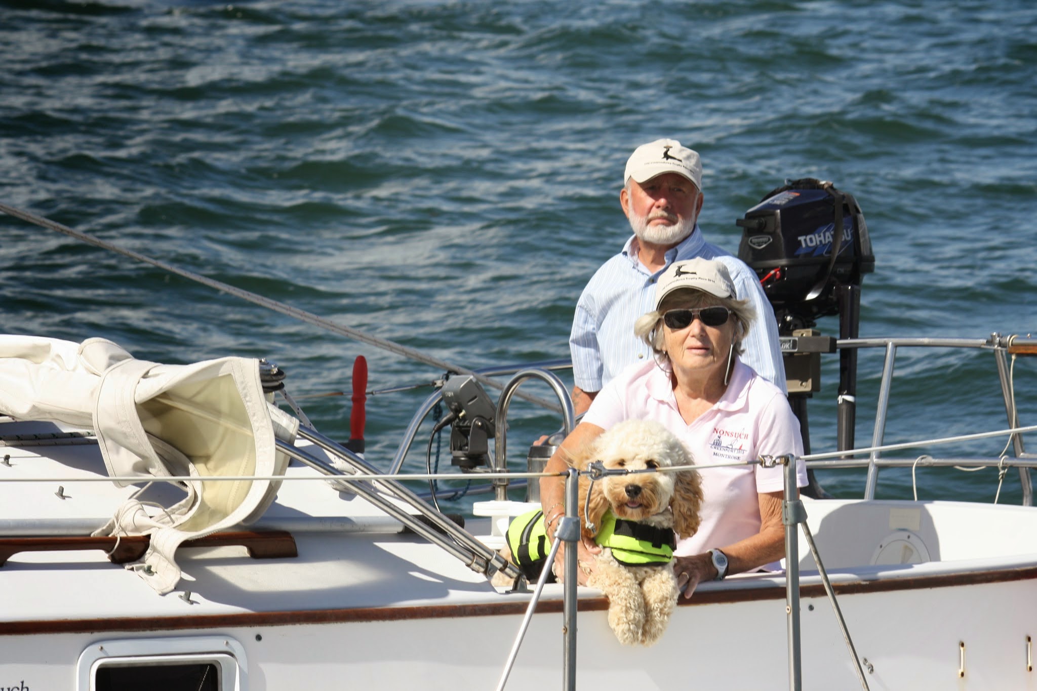 The top 5 skippers and crews of Blue Jay Fleet 50’s first invitational regatta are: (Kneeling) Sue Timken, Ron Brouwer, Mrs. Bill Graulty, Ann MacDougall and Gene Cushman. (Standing) Chet Kitchings, Bobby Lonergan, Bill Graulty, Steve Farrell and Rube Olsen. Photo by Clayton “Bud” Farrar.