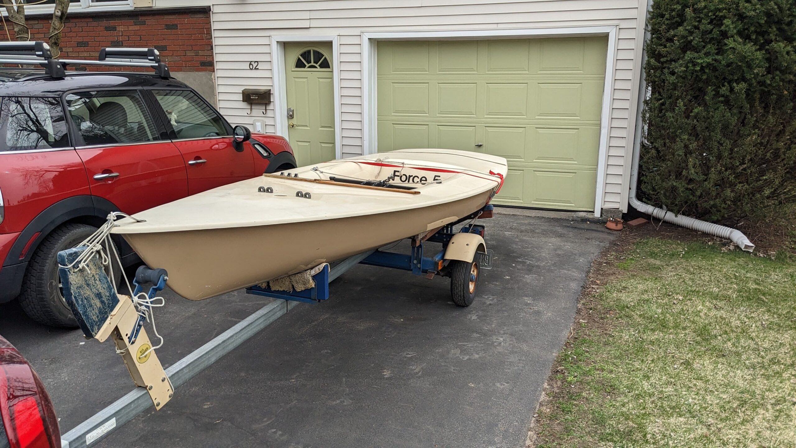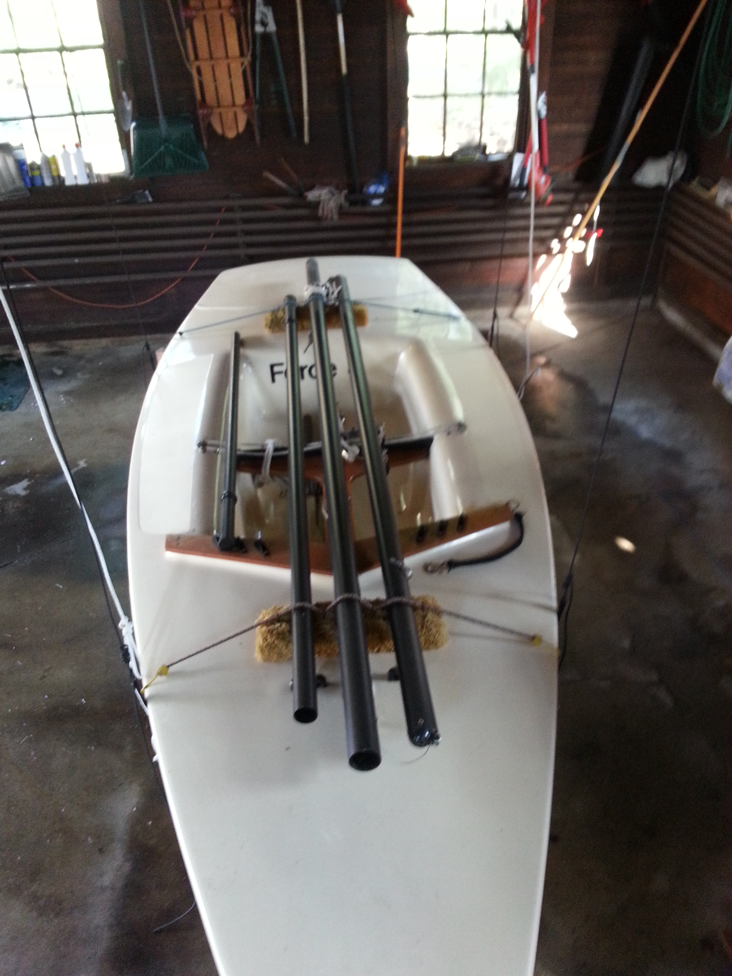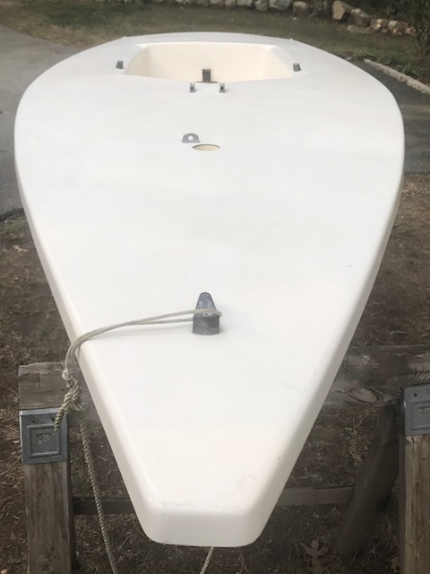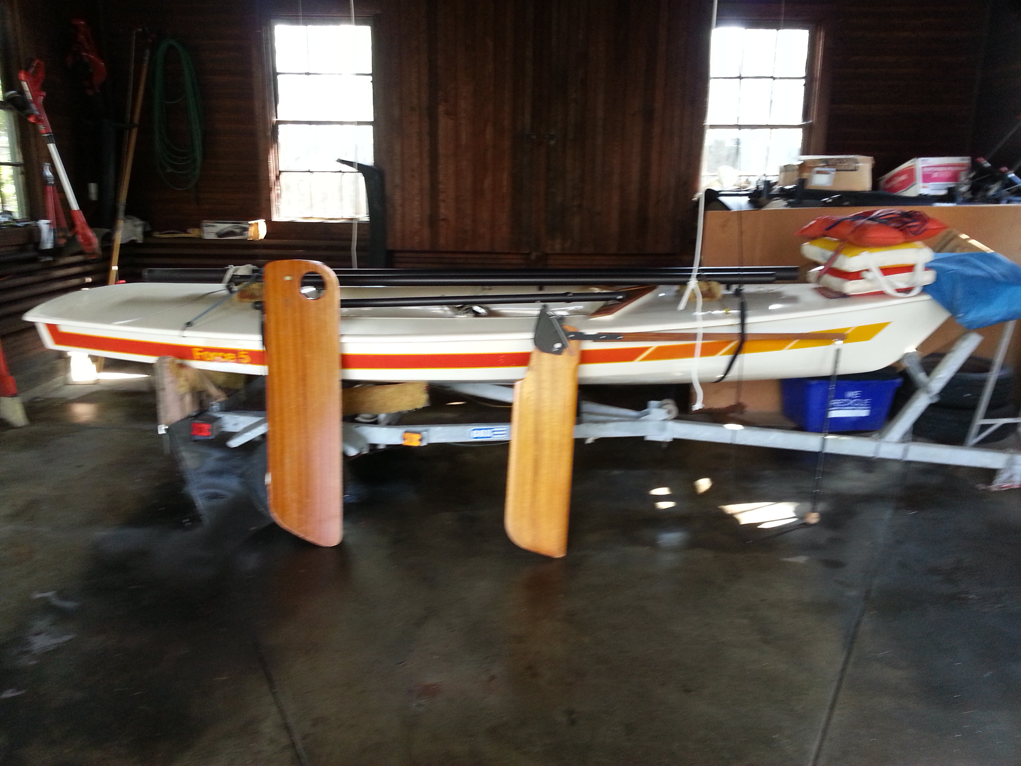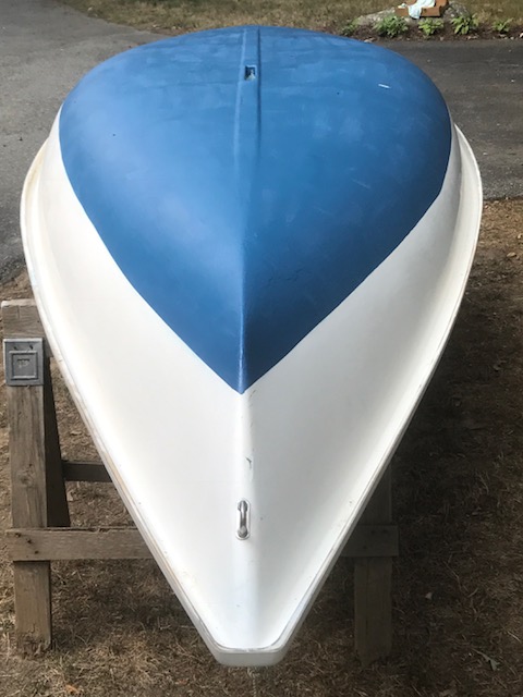 Mid 80’s Force 5 which has seen very little use over the past 30 years (maybe 10-15 outings.) It is in excellent condition with the exception of a small fiberglass / gel coat repair I made where the hull had rested on a trailer support before I discovered the cutout support which is now the cradle for the hull on the trailer.
