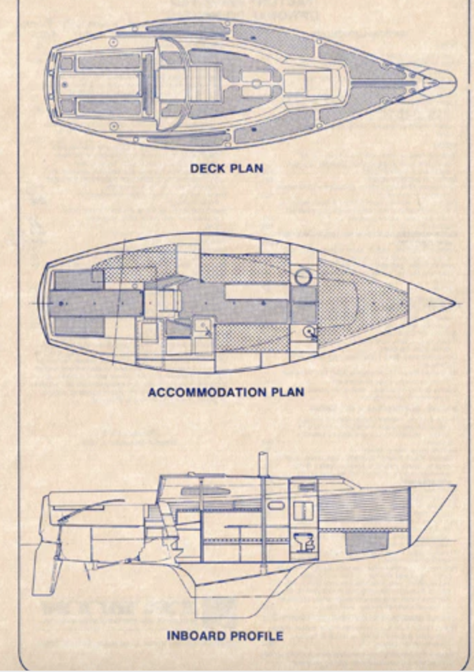 Features: Length – 29’11”; Draft – 5’6”; Fin Keel/Skeg Rudder; Tiller; Weight (Total) -10800 lbs./Keel – 5800 lbs.; Marine Head (With Onboard Sanitation System); Sleeps 6; Bunk Cushions; 6’ Standing Headroom; Navigation Table; Ice Box; Depth Sounder; Port and Stbd Speed Pickups (Non-Operable Reader); Two 12 Volt Batteries; Danforth Anchor and Rode; Bumpers and Dock Lines; Folding Dining Table; Two Water Tanks (25 Gal. Each); Two Sinks (Dining and Bath); Marine Radio; 6 Life Preservers; Dodger (?)